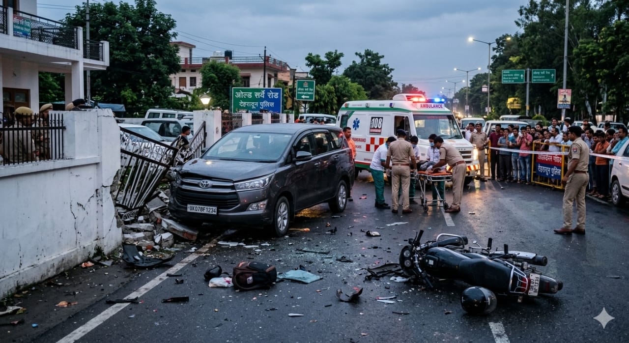 “देहरादून के पॉश इलाके ओल्ड सर्वे रोड पर रफ़्तार का खूनी तांडव देखने को मिला, जहाँ एक अनियंत्रित इनोवा कार ने राहगीरों और बाइक सवारों को अपनी चपेट में ले लिया। इस भीषण हादसे में एक व्यक्ति की जान चली गई और कई अन्य गंभीर रूप से घायल हैं। आरोपी चालक को हिरासत में ले लिया गया है, लेकिन इस घटना ने शहर की सड़कों पर सुरक्षा और बेलगाम रफ्तार पर गंभीर सवाल खड़े कर दिए हैं।”