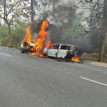 दो कारों की टक्कर के बाद लगी भीषण आग, एक की मौत, पांच घायल