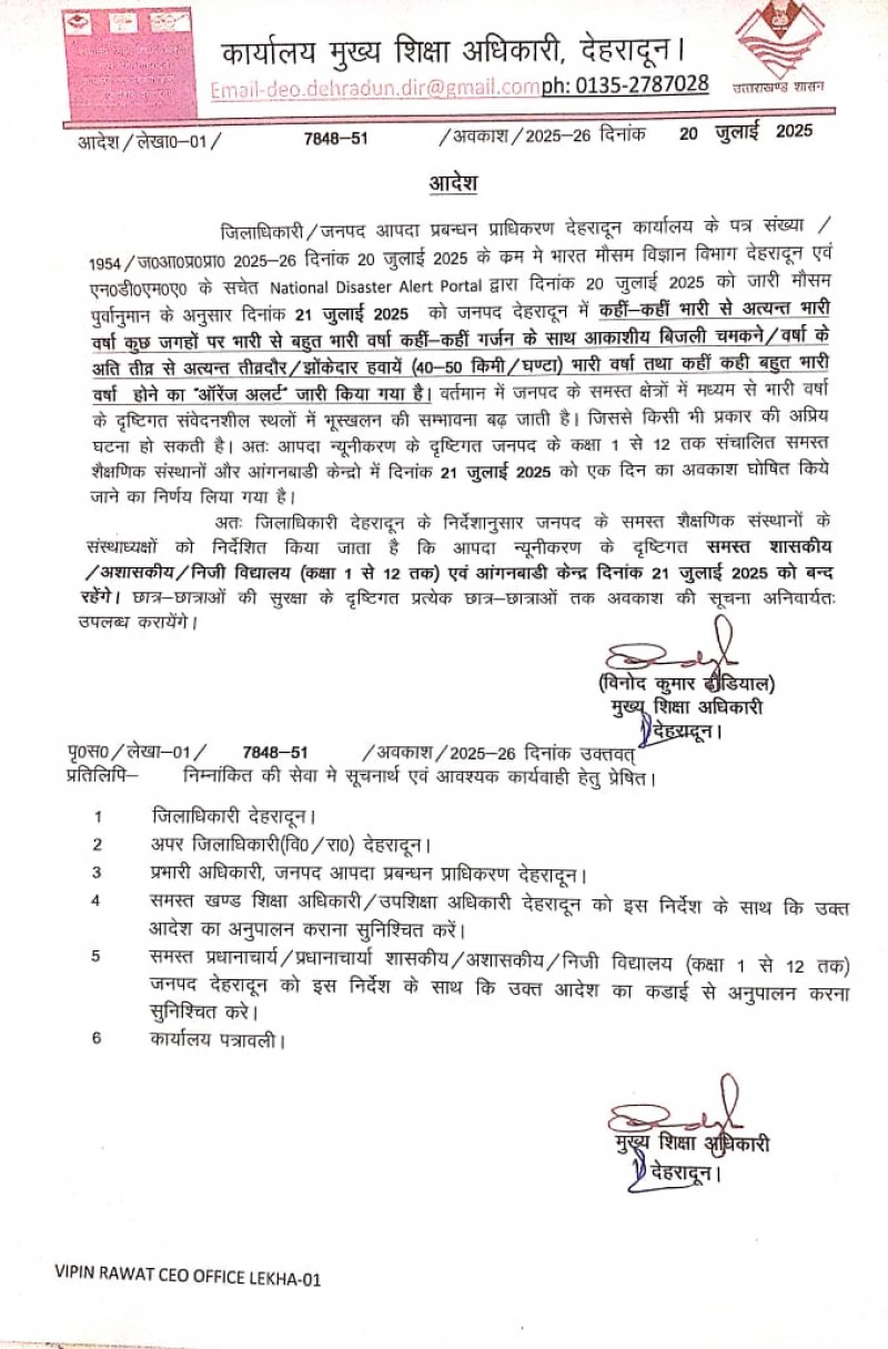 भारी बारिश की चेतावनी के चलते 21 जुलाई को देहरादून के सभी स्कूलों में अवकाश घोषित