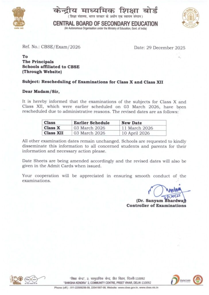 बोर्ड ने सभी संबद्ध स्कूलों को निर्देश दिए हैं कि संशोधित तिथियों की जानकारी तुरंत छात्रों और अभिभावकों तक पहुंचाई जाए, ताकि किसी भी प्रकार की भ्रम या अफवाह की स्थिति उत्पन्न न हो। CBSE ने यह भी बताया है कि बदली हुई तारीखों के अनुसार डेटशीट में आवश्यक संशोधन किए जा रहे हैं और ये नई तिथियां छात्रों के एडमिट कार्ड में भी अपडेट की जाएंगी।