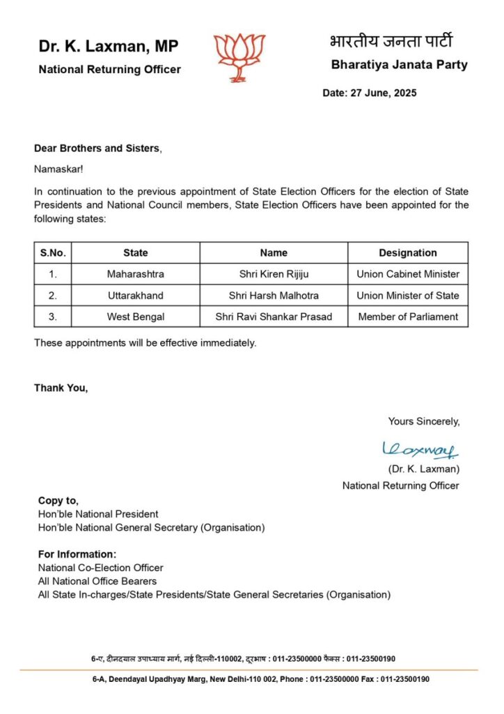 पार्टी की ओर से जारी आधिकारिक सूचना में बताया गया कि महाराष्ट्र में किरेन रिजिजू, उत्तराखंड में हर्ष मल्होत्रा और पश्चिम बंगाल में रविशंकर प्रसाद को राज्य चुनाव अधिकारी नियुक्त किया गया है। यह नियुक्तियां तत्काल प्रभाव से लागू होंगी।