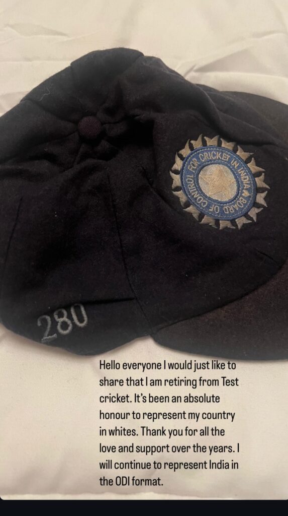 “नमस्कार सभी को, मैं यह बताना चाहता हूं कि मैंने टेस्ट क्रिकेट से संन्यास लेने का फैसला किया है। अपने देश के लिए टेस्ट क्रिकेट खेलना मेरे लिए बेहद गर्व की बात रही है। इन वर्षों में मिले समर्थन और प्यार के लिए सभी का दिल से धन्यवाद।”